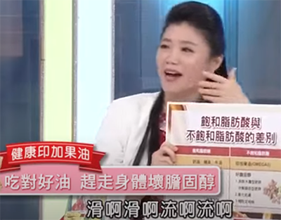 2020年發表的那個影片是電視節目《消費高手》,主持人是支藝樺,來賓則是三位窈窕媽咪/美人。在這裡,主持人可一點也不像是個傻大姐喔。她和來賓之一的淨瑩是負責挑起胡扯的重擔,什麼《發炎會造成肥胖》,《要瘦身就要滅火》,《好油趕走壞油》,虎爛畫得一個比一個大。