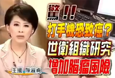 我在谷歌用《主播陳淑貞》搜索,查出她是民視的主播,可是,我在民視的網站搜索,怎麼搜就是搜不到這個影片。所以,我就用《梁永昌、手機、腦瘤》在谷歌搜索,終於在《新唐人亞太台》找到這個影片(日期顯示2011-6-2)。請看世衛首度承認 手機恐致癌。
