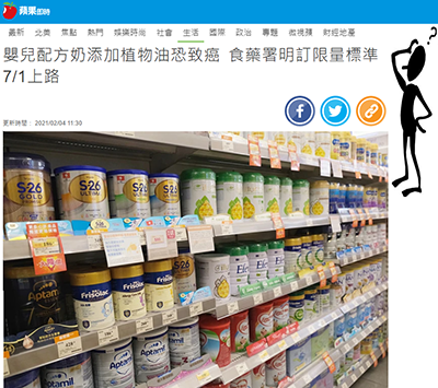 這篇新聞是當天發表在《蘋果即時》的嬰兒配方奶添加植物油恐致癌 食藥署明訂限量標準7/1上路。它的第一段是: