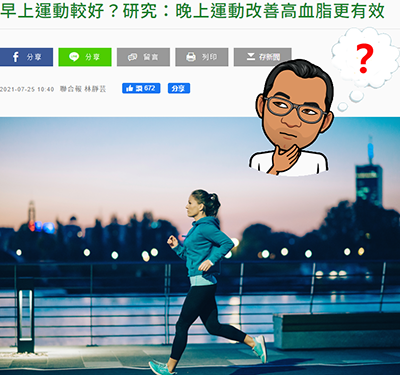 讀者寄來的連結打開的是一篇2021-7-25發表在元氣網的文章,作者是林靜芸醫師,標題是:早上運動較好?研究:晚上運動改善血脂更有效。這篇文章大多是在講故事,而有關研究的部分是這兩段(合併成一段):「這幾年運動盛行,大家都知道早上運動有助晚上好眠;而晚上運動反因情緒高亢,妨礙入睡。但是最新的研究指出,高強度的訓練除外,晚上的運動其實可以幫助深層睡眠。今年五月澳洲基督大學在糖尿病期刊發表實驗報告,讓受試者吃高脂飲食五天之後,再檢驗其血脂肪及心血管健康。之後分成三組,繼續高脂飲食,但是第一組每天早上六點半運動,第二組每天晚上六點半運動,第三組不運動。五天之後再驗指數。結果發現早上運動組與不動組一樣血脂沒有下降,而晚上運動組膽固醇、低密度脂蛋白,甚至血糖曲線、心血管健康度都改善了。」