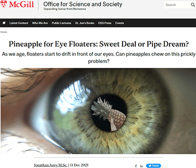 McGill University(馬基爾大學)是一所著名的加拿大學府。它的校友和教職員中有12位諾貝爾獎得主,而現任總理杜魯道也是它的校友。它設有一個叫做Office for Science and Society(科學與社會辦公室,縮寫成OSS)的單位,專門提供與社會相關的科學資訊,尤其是在醫療方面。它在每週六會發布一份叫做McGill OSS Weekly Digest的週報,而裡面通常是有4篇文章。今天發表的週報裡有一篇與台灣相關的文章,標題是Pineapple for Eye Floaters: Sweet Deal or Pipe Dream?(鳳梨治療飛蚊症:甜蜜的交易還是白日夢?)。標題的下面有一行:As we age, floaters start to drift in front of our eyes. Can pineapples chew on this prickly problem?(隨著年齡的增長,飛蚊開始在我們眼前漂浮。 鳳梨能解決這個棘手的問題嗎?)(註:chew和prickly都是雙關語。因為鳳梨酵素是一種水解酶,所以能“咀嚼”,而鳳梨是有刺的,所以是prickly)