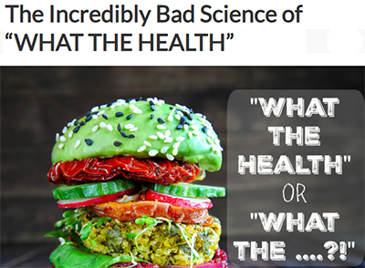 事實上這個影片發行不久後就有一對夫妻檔的飲食達人在Huffpost發表What The Health? More Like What The Hell(What The Health是更像What The Hell)。也就是說,他們認為與其說這個影片是健康,還不如說它是地獄。另一位飲食科學作家也在The Healthy Home Economist(健康家庭經濟人)發表The Incredibly Bad Science of “WHAT THE HEALTH”(令人難以置信的“WHAT THE HEALTH”壞科學),而它的插圖裡就有顯示”WHAT THE HEALTH” OR “WHAT THE …?!”。(註:…就是代表HELL。下面的插圖就是拷貝自這個網頁)