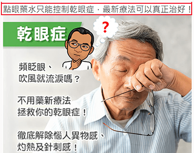 這位讀者寄來的連結打開的是一家診所的文章點眼藥水只能控制乾眼症,最新療法可以真正治好!。文章裡有個小標題是「有效徹底治療乾眼症的創新療法」,而小標題下面有這一段話:【「相應神經調節療法」透過模擬神經傳導的波頻來調節自律神經的活性,…有效改善乾眼症狀,…。】