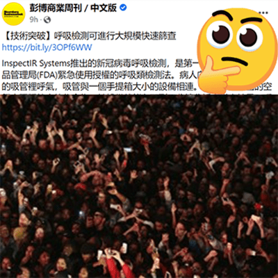 這則報導的時間點是很奇怪,因為早在三個禮拜前(2022-4-14)全美各大媒體就已經報導過同樣信息了。更不好的是,這則彭博報導的內容和圖片(大量人群聚集)可能會讓人以為這個檢測方法真的能防止新冠病毒大肆傳染。