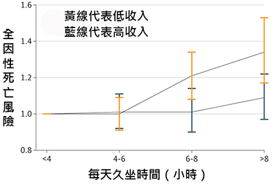 從上面的兩個圖表可以看出,全因性死亡率和心血管事件是跟每天坐著的時間成正相關性,而此一相關性的程度是與收入成負相關性。也就是說,儘管久坐的時間相同,但收入較高的人卻比較不會有健康的問題。