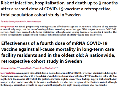 這個瑞典的研究團隊又在2022-7-13在《柳葉刀》發表Effectiveness of a fourth dose of mRNA COVID-19 vaccine against all-cause mortality in long-term care facility residents and in the oldest old: A nationwide, retrospective cohort study in Sweden(第四劑 mRNA 新冠疫苗對長期護理機構居民和最年長老人全因死亡率的有效性:瑞典的一項全國性回顧性隊列研究)。它的結論是:「與第三劑相比,在 Omicron 時代接種的第四劑 mRNA 新冠疫苗與長期護理機構居民和最年長老人的全因死亡風險降低有關。 這些發現表明,即使在 Omicron 變體出現之後,第四劑疫苗也可以防止最年長和最虛弱的人過早死亡。」