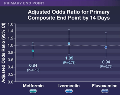 主要事件的調整優勢比:二甲雙胍組為 0.84,伊維菌素組為 1.05,氟伏沙明組為 0.94。
