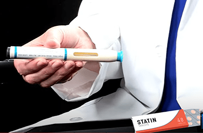我們先來看那篇天下雜誌文章的兩段話(合併):『站在江晨恩醫師的辦公桌前,很難不注意到他櫃子裡一大包注射完的針劑。他總是在隔週的週一下班前,拿起一支外型酷似黃色螢光筆的降血脂針「保脂通」(Praluent)打在腹部。按下按鈕後不出10秒,就可以聽見聲響,表示注射完畢。4年多下來,他靠著這一支通常自費要價近5000元的針劑,加上抑制膽固醇吸收的口服藥,把俗稱「壞膽固醇」的低密度脂蛋白膽固醇從124mg/dL降到25mg/dL,幾乎是新生兒的水準。』