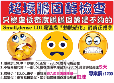 sdLDL也和高三酸甘油酯血症、低 HDL 水平、肥胖、2 型糖尿病(即患有代謝綜合徵的患者)以及感染和炎症狀態都有關聯性,所以聰明的商家就把它叫做Super-bad cholesterol(超壞膽固醇)。
