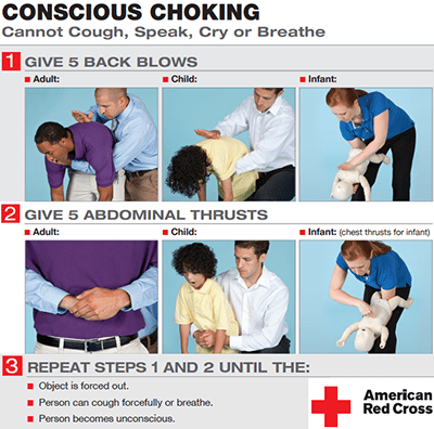 有關噎食(choking)的急救,美國紅十字會和英國紅十字會所提供的指引是大同小異。上面的圖片是拷貝自美國紅十字會,而下面的文字敘述則是翻譯自英國紅十字會: