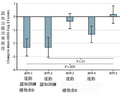 第 5 組(假運動、假認知訓練和安慰劑維他命 D)的認知功能是最差的。