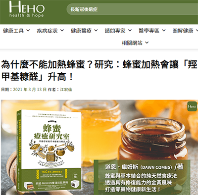 Heho這篇文章的第二個章節標題是『加熱蜂蜜破壞營養成分,還會讓「羥甲基糠醛」攀升』,而裡面的幾句話是:「將主要成分為果糖的溶液(如蜂蜜)加熱,會產生5-羥甲基糠醛(5-hydroxymethylfurfural,HMF),…為什麼我們要在意羥甲基糠醛數值?根據目前的研究顯示,羥甲基糠醛有可能是致癌物。研究白老鼠的實驗帶來了警訊,羥甲基糠醛產生毒性與致癌作用所需要的劑量,極可能遠低於預期。」