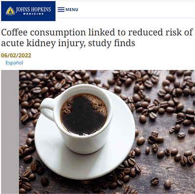 它的第一和第二段(合併)是:「如果您需要另一個理由來喝一杯咖啡開始新的一天,約翰霍普金斯大學醫學研究人員最近的一項研究表明,與不喝咖啡的人相比,每天至少喝一杯咖啡可以降低急性腎損傷的風險。5 月5 日發表在《Kidney International Reports》期刊上的研究結果表明,每天喝任意數量咖啡的人,急性腎損傷風險降低15%,其中每天喝兩到三杯咖啡的人群中觀察到的風險降低幅度最大(風險降低 22%–23%)。」