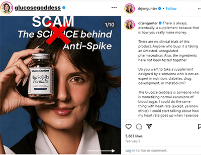 第一篇是營養學博士Nicola Guess 在2024-2-1 發表的The Glucose Goddess has a supplement out. Isit worth buying?(血糖女神有補充品了。 值得購買嗎?)。它的第一段是:【與 Instagram 上 89% 的營養帳戶一樣,「血糖女神」也在銷售一款補充劑。 顯然,它與許多關於「成分已在臨床試驗中經過徹底測試」的誇張聲明一起出售,但補充劑本身尚未經過適當的試驗。 這本身就是一個問題。無論如何,補充劑(不受監管)也存在許多問題,但特別是像這樣的補充劑,其銷售目的是「限制血糖高峰」。請繼續閱讀,了解為什麼我不會推薦任何人,無論是否患有糖尿病 – 購買這種補充劑。】