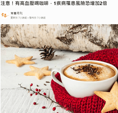 上面的連結打開的是一篇當天發表在《常春月刊》的文章,標題是:注意!有高血壓喝咖啡,1疾病罹患風險恐增加2倍。