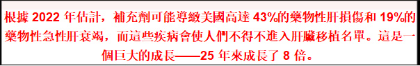 隨著補充劑產業飛速發展,其下游副作用也隨之增加:根據 2022 年估計,補充劑可能導緻美國高達 43% 的藥物性肝損傷和 19% 的藥物性急性肝衰竭,而這些疾病會使人們不得不進入肝臟移植名單。這是一個巨大的成長——25 年來成長了 8 倍。
