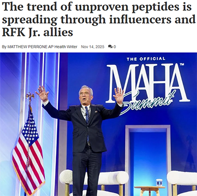 CNN在2025-11-15發表The trend of unproven peptides is spreading through influencers and RFK Jr. allies(使用未經證實的胜肽的風潮正在透過網紅和小羅伯甘迺迪的盟友來蔓延)。