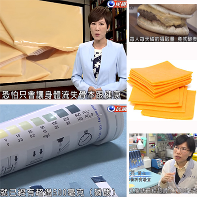 - 檢測的結果是由長庚毒物科實驗室的林中英博士來做說明。她說,一克起司就已經含有超過500毫克的磷酸鹽,所以光是一片起司就已經含有超過1000毫克的磷酸鹽。(註:這位林中英博士常出現在電視節目。請看泡麵重金屬,我的天呀)。