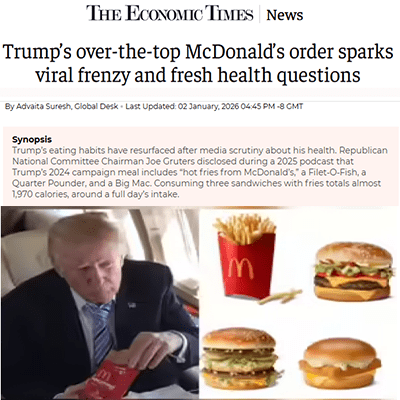 《經濟時報》在1月2日發表Trump’s over-the-top McDonald’s order sparks viral frenzy and fresh health questions(川普誇張的麥當勞點餐引發網路熱議,並引發新的健康疑問)。