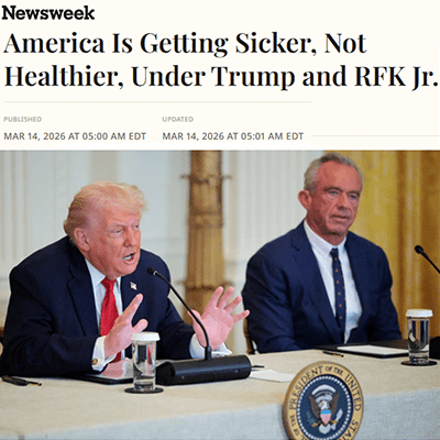 《新聞周刊》前天(2026-3-14)發表一篇觀點文章America Is Getting Sicker, Not Healthier, Under Trump and RFK Jr.(在川普和小羅伯特甘迺迪的帶領下,美國是越來越多病,不是越健康),作者是代表麻州的聯邦參議員Edward J. Markey和2021-2023年期間的CDC主任 Rochelle Walensky。我把它翻譯如下: